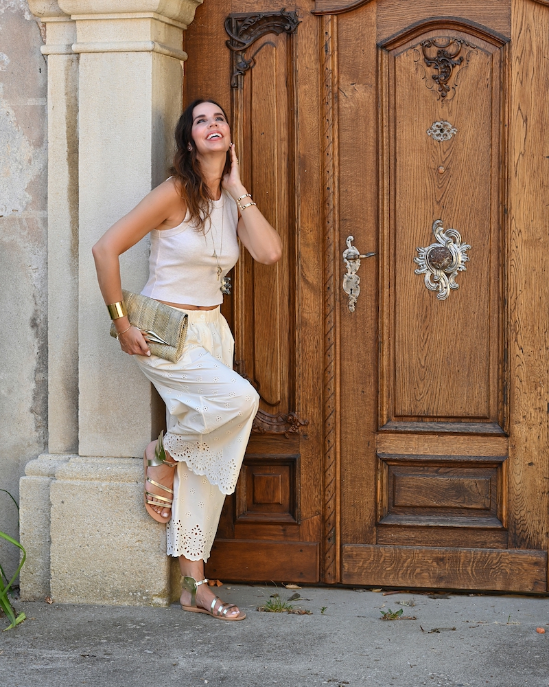 My style is as follows: pants princess Tam Tam, top Aerie, sandals Ancient Greek, bag Diane von Furstenberg, jewelry JCrew in Sezane.